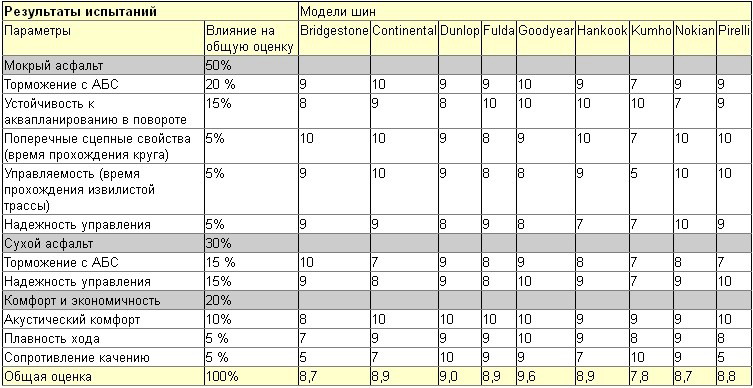 Резина Goodyear уверенно победила в тесте. Она безопасная, надёжная во всех отношениях и не такая дорогая на российском рынке. Семь моделей покрышек получили хорошие оценки и заслужили звание «добротных», а вот шины марки Kumho выбиваются из общей массы. Их результаты ниже общего уровня.