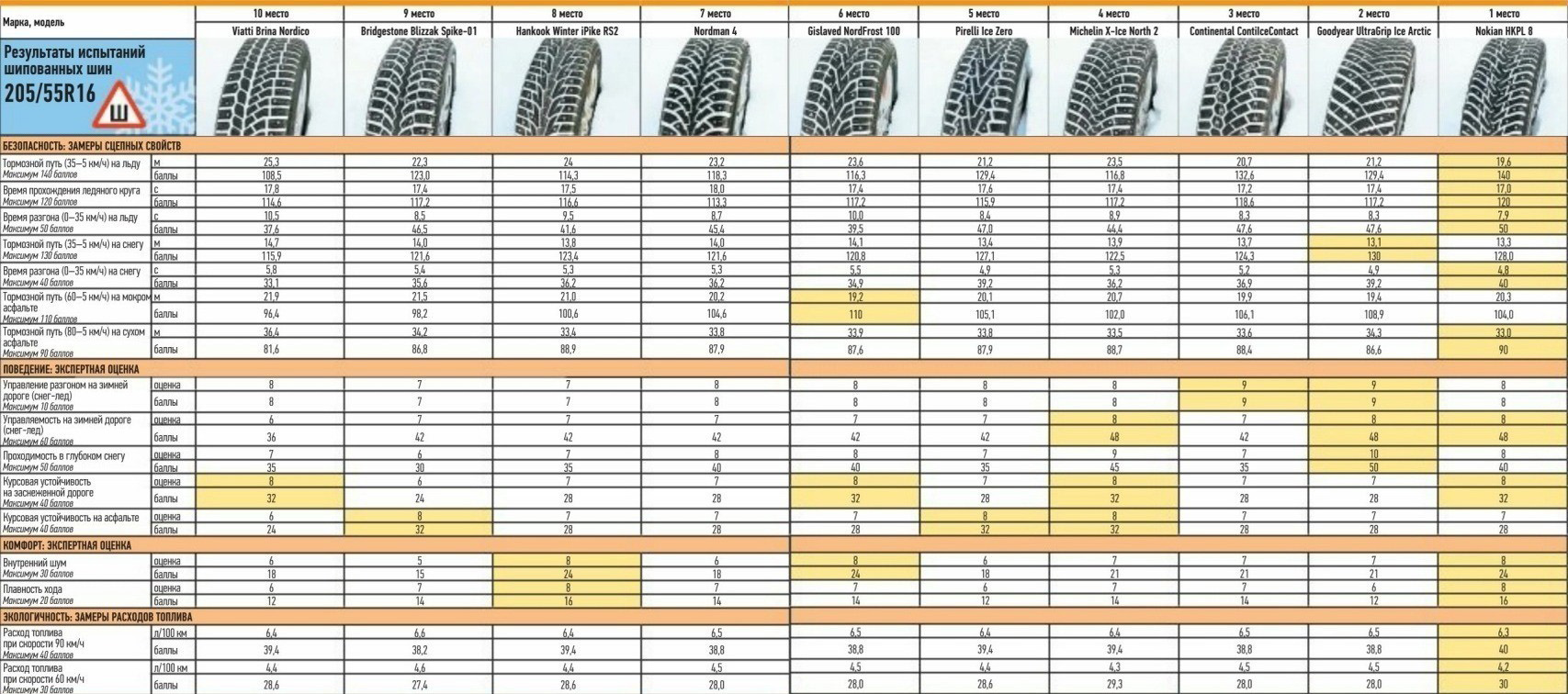 Обратите внимание, что четыре комплекта шин из десяти тестируемых произведены в нашей стране.