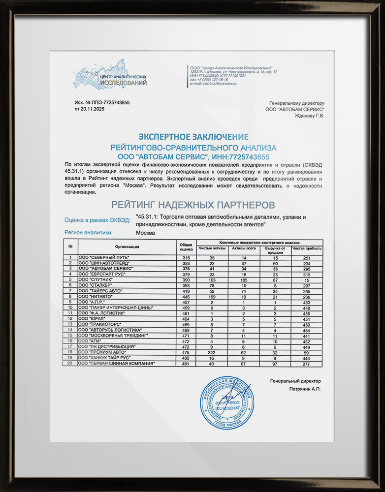По результатам ежегодного экспертного анализа, проводимого Центром аналитических исследований в рамках программы «Лучшее предприятие отрасли 2025», компания «BS-Tyres» включена в Рейтинг надёжных партнёров.